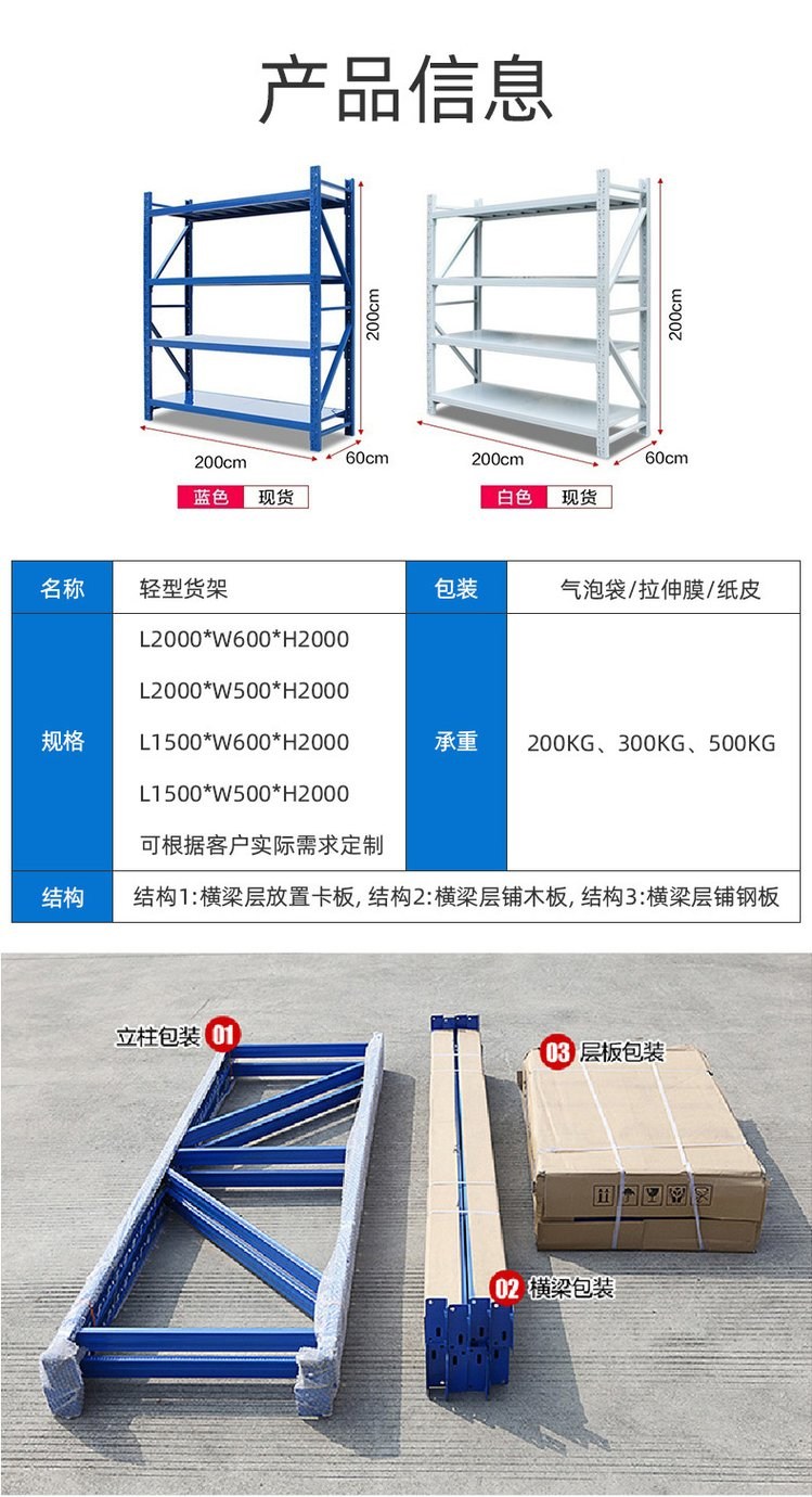 轻型货架又称为轻型层板货架或轻型仓储货架,主要由立柱、横梁和层板组成,采用插接式结构,无需螺丝固定,装拆灵活快捷。单层承重一般在100kg—300kg之间,适用于人工存取、轻型物料存放等场景。
